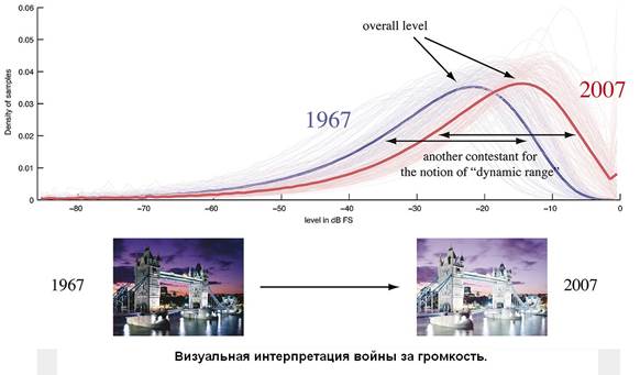 Не составит труда найти массу людей, публикаций в прессе и Интернете, единодушно обвиняющих войну за громкость в том, что она разрушает музыку. Многие связывают её с уменьшением «динамического диапазона», хотя никто обычно не объясняет, каким он должен быть. Однако, как мы узнали в этой статье, война за громкость фактически не привела к уменьшению такого параметра, как диапазон громкости, определённый по методике EBU 3342 (по сути дела, это довольно близко к тому, что люди как раз и подразумевают под словами «динамический диапазон»). При этом, невозможно установить никакого уменьшения динамической вариабельности ни в каком масштабе. Так что ж за проблема с войной за громкость? Очевидно, ограничение делает что-то «неправильное» с сигналом, иначе б люди не жаловались – даже при том, что они указывают на не совсем корректный критерий, описывающий его параметры. Чтобы правильно ответить на этот вопрос, попробуем представить, что звук – это фотография, и сделаем анализ этого «фото» по такому параметру, как распределение яркостей. У Фотошопа это можно найти в диалоговом окне Levels. Чтобы сделать оценку, алгоритм проверяет все пиксели в картинке и затем сортирует в зависимости от яркости. В результате, получается график распределения, показывающий, включает ли изображение преимущественно светлые, средние и тёмные области, и их относительные пропорции. Тот же самый процесс можно провернуть и со звуковыми файлами: мы проверяем все сэмплы в песне и сортируем их по абсолютному уровню. Как показано на иллюстрации, кривая распределения может рассказать много интересного. Посмотрим на кривую распределения для песен, выпущенных в 2007 году (красная кривая). Их пики имеют более высокий уровень, чем в песнях 1967 года (синяя кривая). Очевидно, что более новые песни в среднем намного громче. Следующим делом, посмотрим на ширину обеих кривых: они сравнимы, и это означает, что кое-какие вещи, близкие к динамической вариабельности, остались неизменными между 1967 и 2007 годами. Теперь посмотрим на всплеск в правой стороне красной кривой. Он показывает, что песни этого года имеют ненормально высокую плотность высокоуровневых сэмплов: кривая перестаёт следовать за «нормальным» распределением Гаусса в зоне высоких уровней. Это результат воздействия brickwall-ограничителей. Продолжим сравнивать звук и изображение. Представим, будто последние 20 лет все картинки в журналах и книгах становились всё ярче и ярче. В них всё ещё есть глубокий чёрный цвет, контраст не повреждён, но при этом все картинки выглядят очень яркими. Подобные вещи иллюстрируют нам две фотографии Тауэра. Можно подумать, будто всё в наши дни прямо таки «сияет», хотя здравый смысл предполагает, что есть какие-то вещи, которые не могут быть настолько сияющими ни при каких условиях. Это тем более верно в случае со звуком, для которого «яркость» означает не только высокую плотность засвеченных пикселей. Это также означает уменьшенный крест-фактор, изменённую огибающую, использование второй парадигмы громкости и, в особо тяжёлых случаях, искажение. Хотя, в общем-то, эти характеристики не обязательно означают что-то плохое, но всё-таки здравый смысл нам подсказывает, что такого не должно быть буквально в каждой записи. Важно понимать, что делаете, и как это соотносится с тем звуком, к которому Вы стремитесь. 