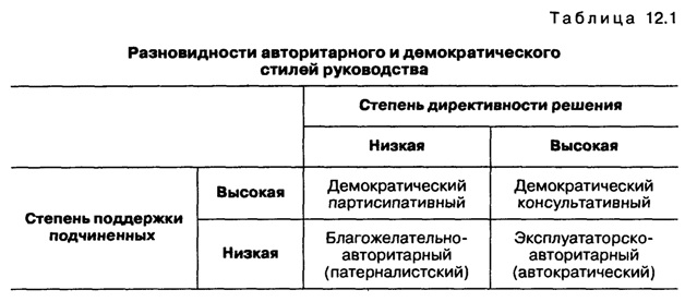 Исторически первым и до сегодняшнего момента, видимо, наиболее распространенным на практике стилем руководства является авторитарный. Он считается универсальным, особенно часто у первых лиц. Его характерными чертами являются: 1) централизация всей власти в руках руководителя и принятие им единоличных решений, которые впоследствии навязываются исполнителям; 2) дистанцирование его от подчиненных и преобладание между ними официальных отношений; 3) отдача исполнителям в приказной форме распоряжений без объяснения их связи с общими целями и задачами организации; 4) широкое использование администрирования, наказаний. В результате в организации (подразделении) формируется неблагоприятный морально-психологический климат и создается почва для развития производственных конфликтов. Авторитарный стиль за счет сосредоточения всей полноты власти в руках руководителя обеспечивает максимальную производительность при выполнении простых видов деятельности, позволяет быстро стабилизировать сложную ситуацию. Но он не формирует внутренней заинтересованности исполнителей к труду, ибо излишние дисциплинарные меры вызывают в человеке страх и злость, подавляют инициативу Применение такого стиля эффективно тогда, когда подчиненные полностью находятся во власти руководителя, например на военной службе, или безгранично ему доверяют (скажем, как актеры режиссеру или спортсмены тренеру), а тот уверен, что они не способны самостоятельно действовать правильным образом. В целом сторонниками авторитарного стиля руководства являются холерики, харизматические и творческие личности. Авторитарный стиль руководства обобщенно отражает так называемая теория XД. Мак-Грегора, излагающая взгляды Ф. Тейлора на работника индустриальной эпохи. В соответствии с ней среднему человеку присуще отвращение к труду и желание избежать его при первой же возможности. Большинство работников ни к чему не стремятся, избегают брать на себя ответственность и предпочитают, чтобы ими руководили. Поэтому людей требуется, в основном с помощью наказаний, принуждать к выполнению возложенных на них обязанностей и непрерывно контролировать их действия. Однако Мак-Грегор оговаривает, что подобное поведение вызывается не столько свойствами человеческой натуры, сколько теми внешними условиями, в которых людям приходится жить и трудиться. В своей теории Y он утверждает, что на самом деле затраты физических и умственных усилий в процессе трудовой деятельности столь же естественны, как, например, игра или отдых. Большинство людей обладают достаточной фантазией, изобретательностью, творчеством, которые можно с успехом применить в интересах организации. В результате НТР большинство видов физического труда и рутинные операции, относящиеся к умственному труду, начинают выполнять машины под управлением самих же машин. Это неминуемо приводит к изменению отношения людей к своей работе. Сегодня, по мнению Мак-Грегора, даже простому человеку не должно быть присуще чувство отвращения к ней. При соответствующих условиях она может и должна служить источником наслаждения, а вовсе не наказанием, которого люди старались бы избежать. Теория Y описывает демократический стиль руководства, который доминирует современных фирмах. Он характеризуется высокой степенью децентрализаци