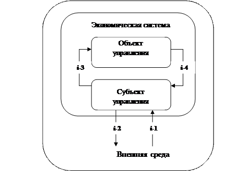 Для анализа структуры информационной системы рассмотрим структуру экономической системы, являющейся базисной для структур системы автоматического управления (САУ), автоматизированной системы управления (АСУ) и автоматизированных информационных систем (АИС). С позиции кибернетики структуру любой экономической системы можно представить субъектом и объектом управления, где основные информационные потоки между внешней средой, объектом и субъектом управления помечены стрелками i-1, i-2, i-3, i-4. Рассмотрим структуру экономической системы, представленной на рисунке 6. Объект управления представляет собой подсистему материальных элементов экономической деятельности (сырьё, материалы, оборудование, работники, и др.) и хозяйственных процессов (основное и вспомогательное производство, снабжение, сбыт, и др.). Субъект управления – совокупность взаимодействующих структурных подразделений экономической системы (отделы, подразделения и т.п.), осуществляющих планирование, учёт, контроль, регулирование и анализ деятельности. Под потоком информации понимается целенаправленное движение информации от источников до потребителей. Формирование информационных потоков в системе управления происходит на основе информационной системы. i-1 – информационный поток из внешней среды в систему управления, который, с одной стороны, представляет собой поток нормативной информации, создаваемый государственными учреждениями в части законодательства, а с другой стороны – поток информации о конъюнктуре рынка, создаваемый конкурентами, потребителями, поставщиками; i-2 – информационный поток из системы управления во внешнюю среду; i-3 – информационный поток из системы управления на объект, представляет собой совокупность плановой, нормативной и распорядительной информации для осуществления хозяйственных процессов;