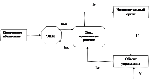 Для функционирования любой системы управления необходима информация. На рисунках 6 и 7 стрелочками обозначаются информационные потоки, т.е. движение информации между элементами системы. Разница информационных потоков в представленных системах управления заключается лишь в том, как их интерпретирует автор, а смысловая нагрузка одинаковая – перемещение информации. Ярко выраженный целевой информационный характер управления подтверждается его кибернетическим определением: управление есть процесс целенаправленной переработки информации. В зависимости от того, в какой системе (простой, сложной, большой) осуществляется управление, различают системы автоматического управления (САУ) и автоматизированные системы управления (АСУ). В системах, в которых заранее известны описание объекта управления и алгоритм управления им осуществляется автоматическое управление. По принципу управления системы автоматического управления могут быть разомкнутыми и замкнутыми. В разомкнутых системах измеряется возмущение, отклоняющее объект от заданного состояния и вырабатывается воздействие, компенсирующее возникшее возмущение. Такая система не способна длительное время управлять неустойчивым объектом. В замкнутых системах, примерная схема которых изображена на рисунке 3 реализуется идея обратной связи, благодаря которой информация об отклонении управляемого объекта от заданного состояния позволяет выработать воздействие, возвращающее объект в это состояние. Упрощённая структурная схема замкнутой системы автоматического управления схожа по составным элементам с укрупнённой структурной схемой системы управления, изображённой на рисунке 8, с добавлением преобразователей. В качестве управляющего органа используется компьютер, который с помощью программы или информационного потока Iвх выдаёт результат обработки информации, обычно это физический сигнал. Этот сигнал управления, за счёт преобразователя 1 приводит в действие исполнительный орган, который в свою очередь возвращает объект управления в заданное программой компьютера состояние. Состояние объекта управления меняется под воздействием внешних возмущений, что определяет значение сигнала обратной связи, которое через преобразователь поступает в компьютер. Преобразователи необходимы для изменения уровней или природы проходящих через них сигналов. С ростом и усложнением производства объекты приобретают характер сложных и больших систем, имеющих большое число элементов и подсистем, связи между которыми не всегда ясны, а критерии функционирования не обладают достаточной чёткостью. В этих условиях использовать результаты теории автоматического управления в полной мере не удаётся, и в контур управления, помимо человека – оператора ЭВМ, действующего по заданным алгоритмам, включается лицо, принимающее решение (ЛРП). Наличие лица, принимающего решение в контуре управления – отличительная черта автоматизированных систем управления.
