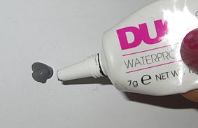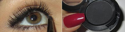 Подождите 1-2 минуты, пока клей немного застынет. Используя темные тени для глаз (например, MAC Carbon) и тонкую кисть, закамуфлируйте линию роста ресниц.