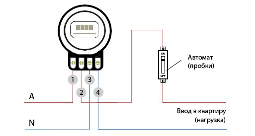 Однофазные электросчётчики имеют четыре Схема подключения однофазного электросчётчика: