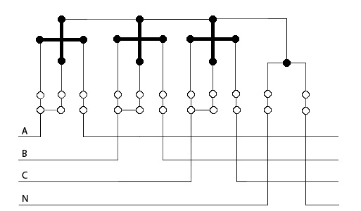 Трёхфазные счётчики, в отличие от однофазных могут иметь разные схемы подключения, в зависимости от типа счётчика. Существуют счётчики прямого включения (более 5 Ампер) - они подключаются без трансформаторов тока и счётчики с токовым номиналом 5 Ампер - их можно поключать с трансформаторами тока и напрямую. Буква У в маркировке счётчика (напр. СА4У-И672М) означает, что он может быть подключен как через трансформаторы тока, так и без них (универсальный). Схема подключения трёхфазного электросчётчика прямого включения:
