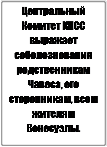 ФИДЕЛЬ КАСТРО: МЫ ПОТЕРЯЛИ НАШЕГО ЛУЧШЕГО ДРУГА Во второй половине дня, скончался лучший друг, какого имел кубинский народ на протяжении своей истории. Звонок по спутниковой связи принес горькое известие. Значение употребленных слов было совершенно ясным. Хотя мы и знали о критическом состоянии его здоровья, известие нанесло нам сильный удар. Я вспомнил, сколько раз он в шутку говорил мне, что, когда мы оба выполним до конца нашу революционную задачу, он пригласит меня на прогулку по реке Араука на венесуэльской территории – ему это напоминало об отдыхе, которого у него не было никогда. Нам выпала честь разделять с боливарианским лидером те же идеалы социальной справедливости и поддержки эксплуатируемых. Бедняки в любой части мира – бедняки. «Пусть Венесуэла даст мне то, в чем я мог бы послужить ей: она имеет во мне сына», – провозгласил Национальный герой и Апостол нашей независимости Хосе Марти, путешественник, который, еще не отряхнув дорожной пыли, спросил, где находится. Марти знал чудовище потому, что жил в его чреве. Разве можно пройти мимо глубоких слов, пророненных им в неоконченном письме своему другу Мануэлю Меркадо накануне гибели в бою? «Каждый день мне грозит опасность отдать жизнь за мою страну и за мой долг – ведь я его сознаю и во мне есть духовные силы, чтобы его исполнить: вовремя, посредством независимости Кубы помешать Соединенным Штатам распространиться по Антилам и тем сильнее обрушиться на наши земли Америки. Все, что я сделал до сего дня и что еще сделаю – для этого. Мне приходилось пребывать в молчании, идя как бы окольным путем, ибо есть вещи, которые достижимы лишь будучи сокрытыми…» Тогда уже прошло 66 лет после того, как Освободитель Симон Боливар писал: «…Соединенные Штаты, кажется, предназначены Провидением поразить Америку бедствиями во имя Свободы». 23 января 1959 г., спустя 22 дня после революционного триумфа на Кубе, я посетил Венесуэлу, чтобы выразить благодарность ее народу и правительству, взявшему власть после диктатуры Переса Хименеса, за присылку нам 150 винтовок в конеце 1958-го. Тогда я сказал: «…Венесуэла – родина Освободителя, там была задумана идея союза народов Америки. Поэтому Венесуэла должна быть страной-лидером союза народов Америки; мы, кубинцы, поддерживаем наших братьев из Венесуэлы. «Я говорил об этих идеях не потому, что мною движет какая-либо личная амбиция личного типа, даже жажда славы, потому что, в конце концов, жажда славы не перестает быть тщеславием, и, как говорил Марти, «вся слава мира умещается в одном зерне маиса». Вот почему, начав говорить так с народом Венесуэлы, я делаю это, честно и глубоко думая, что если мы хотим спасти Америку, если хотим спасти свободу в каждом из наших обществ, которые в конечном счете – части большого общества, каково общество Латиноамерики; так что, если мы хотим спасти Революцию Кубы, Революцию Венесуэлы и революцию всех стран нашего континента, мы должны сблизиться друг с другом и должны твердо поддерживать друг друг, ведь поодиночке и разобщенные мы потерпим провал». Это сказал в тот день, и сегодня, 54 года, он это подтвердил! Я должен только включить в этот список и другие народы мира, более полувека бывшие жертвами эксплуатации и грабежа. Такова была борьба Уго Чавеса. Он и сам не подозревал, как был велик. Всегда до победы, незабвенный друг! 