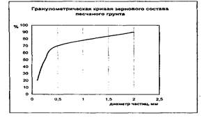 Наименование песчаного грунта согласно 2.02.01-83 устанавливают путем последовательного суммирования веса фракций сверху вниз. Наименование грунта устанавливают по первому удовлетворяющему признаку (табл.2.2). Для песков крупных и средней крупности определяют коэффициент неоднородности, для чего строят суммарную кривую гранулометрического состава. Кривая строится в натуральном или полулогарифмическом масштабе. При построении кривой по оси абсцисс откладываются диаметр или логарифм диаметров частиц, по оси ординат — содержание частиц, диаметр которых меньше указанного на оси абсцисс в %. Пример гранулометрической кривой зернового состава песчаного грунта дан на рис. 2.2.