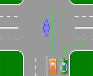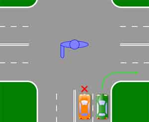 Рис. 7 Жест регулировщика №2 Подобным образом анализируем этот жест регулировщика: Вывод: на представленной схеме водитель желтого авто может продолжить движение только прямо, водитель зеленого - прямо или направо.