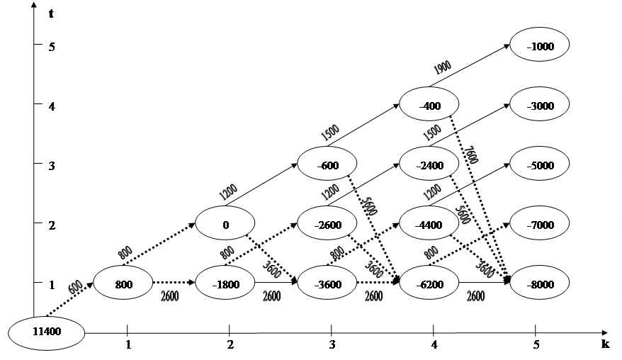 2. Определим оптимальную стратегию (план-график) эксплуатации оборудования, обеспечивающую минимальные суммарные затраты производственного предприятия «ТИТАН» на эксплуатацию в течение 5 летв условиях текущих цен. Строим оптимальные траектории, перемещаясь из точки (0, 0) по пунктирным линиям в конечное состояние Получаем следующие наборы точек, соответствующие управлениям: (0, 0); (1, 1); (2, 1); (3, 2); (4, 1); (5, 2) - (0, 0); (1, 1); (2, 2); (3, 1); (4, 1); (5, 2) - (0, 0); (1, 1); (2, 2); (3, 1); (4, 2); (5, 1) -