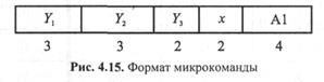 В поле адреса будет располагаться адрес памяти — двоичный номер ячейки, а в полях Yi и х — коды микроопераций и логических условий. Окончательно формат микрокоманды будет иметь вид, приведенный на рис. 4.15.