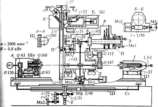 Рисунок 3 Кинематическая схема центрового круглошлифовального станка: А — передняя бабка; Б — устройство правки шлифовального круга; В — механизм подачи; Г — задняя бабка; Д — шлифовальная бабка; Е — механизм ручного перемещения стола; П — пиноль устройства правки; JI — лимб; М1, М2 — электродвигатели; МЗ, М4 — гидродвигатели; Mxl, Мх2 — маховики; Мф — муфты; Мэ1, Мэ2 — муфты электромагнитные; Ц1, Ц2, ЦЗ и Ц4 — гидроцилиндры; Шп — шпиндель; Рк — рукоятки; Ст — нижний стол