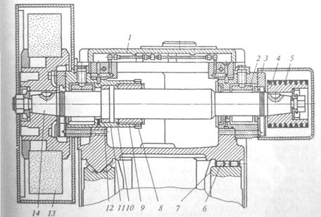 Рисунок 4 Шлифовальная бабка круглошлифовапьного станка: 1 — корпус; 2 — подшипник скольжения; 3 — крышка; 4 — шкив; 5 — клиноременная передача; б — направляющие качения; 7— станина; 8 — контргайка; 9 — гайка; 10 и 12— кольца; 11 — обойма; 13 — шлифовальный круг; 14— шпиндель