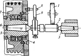 Рисунок 15 Установка заготовки в неподвижных центрах круглошлифовального станка: 1 — ось шлифовального круга; 2— заготовка; 3 — задний центр: 4— поводковый диск; 5— шпиндель; 6 — передний центр; 7 — шкив; 8 — палец; 9 — хомутик
