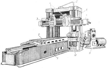 Основные узлы станка (рис. 3): 1 —станина; 2 — стол; 3— траверса; 4 — вертикальные суппорты; 5 — подвеска пульта управления; 5 — портал; 7 — коробка подач вертикальных суппортов; 8 — коробка подач бокового суппорта; 9—привод стола; 10—боковой суппорт. Техническая характеристика станка мод. 7212. Максимальные размеры обрабатываемой заготовки: длина 4000 мм, ширина 1250 мм, высота 1120 мм; скорость рабочего хода стола 4--80 м/мнн; обратного—12-80 м/мин; подачи вертикальных суппортов — горизонтальная 0, 5-25 мм/дв. х, вертикальная 0.25-12, 5 мм/дв. х; мощность электродвигателя привода стола 55 кВт.