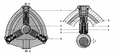Рис.3. Радиально-поршневой насос с клапанным распределением Насос состоит из корпуса 1, приводного вала 3, имеющего эксцентрическую шейку (кулачок) в зоне трех качающих узлов 6, каждый из которых включает в себя поршень 5, всасывающий клапан 8 и нагнетательный клапан 2 Сферическая головка 9 закреплена в корпусе 1. Поршень 5 через цилиндрическую опорную поверхность опирается на шейку вала 3, при этом пружиной 4 обеспечивается постоянный контакт между втулкой 7 и сферической головкой 9. Рабочие камеры насоса образуются поверхностями поршней 5 втулок 7 и сферических головок 9. При вращении кулачка каждый поршень совершает за один оборот вала два хода: один-вверх, другой-вниз. Всасывание осуществляется при движении поршня вниз. При этом объем рабочей камеры увеличивается, открывается всасывающий клапан 8 и жидкость через канавку на поверхности кулачка поступает в рабочую камеру. Нагнетание происходит при дальнейшем повороте кулачка, но уже при движении поршня вверх: клапан 8 прижимается к уплотнительной кромке, жидкость в рабочей камере сжимается и открывается напорный клапан 2 в сферической головке 9. Жидкость под давлением поступает в круговой канал, соединяющий качающие узлы и далее на выход насоса