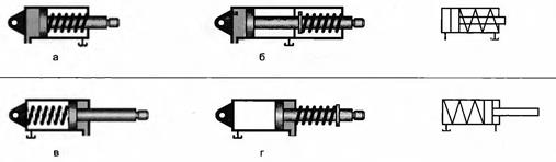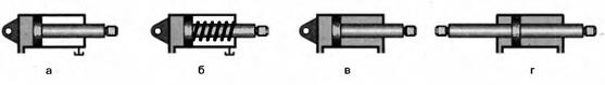 Рис 2 Поршневые гидроцилиндры Поршневые гидроцилиндры одностороннего действия выполняют с пружинным возвратом (рис. 4.2, б) или без него (рис. 4.2, а). Гидроцилиндры с пружинным возвратом. Гидроцилиндры с пружинным возвратом в исходное положение применяют в тех случаях, когда отсутствуют внешние силы для возврата выходного звена в исходное положение. В зависимости от конструктивного исполнения, подобные гидроцилиндры работают на выдвижение (рис. 3, а, б) или на втягивание (рис. 3, в, г) штока. Возвратные пружины могут быть установлены как внутри гидроцилиндра (рис. 3, а, в), так и снаружи (рис. 3, б, г). Поскольку использование возвратных пружин в таких конструкциях, приводит к ограничению величин рабочих ходов такие гидроцилиндры преимущественно применяют в различного рода зажимных механизмах.