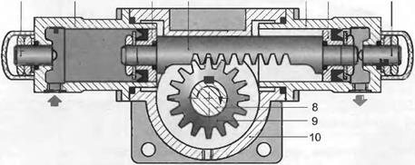 Поворотные гидродвигатели применяют в случаях, когда необходимо повернуть ведомый объект вокруг некоторой оси на угол обычно не превышающий 360. Благодаря им, кинематические цепи в машинах и механизмах могут быть полностью сокращены, либо значительно упрощены, В зависимое и от способа создания момента на выходном валу, поворотные гидродвигатели подразделяют на пластинчатые (или лопастные), поршневые с реечной передачей, кривошипно-шатунные и поршневые с винтовым преобразованием. Поршневой поворотный гидродвигатель с реечной передачей (рис. 1). Этот гидродвигатель состоит из корпуса 10 с расположенным в нем выходным валом 8, шестерня 9 которого входит в зубчатое зацепление с рейкой 4, соединяющей между собой два поршня 3 и 6. Поршни 3 и 6 расположены в гильзах 2 и 5 соответственно, жестко связанных с корпусом 10.