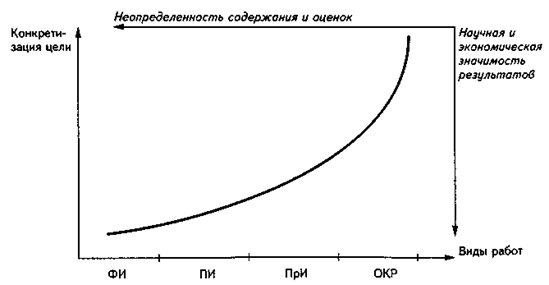 Рис 3 4 Особенности различных видов исследований: ФИ - фундаментальные исследования, ПИ - поисковые исследования, ПрИ - прикладные исследования; ОКР - опытно-конструкторские разработки Фундаментальные исследования, как правило, имеют наиболее общий и абстрактный характер. Они направлены на расширение знаний и понимание наиболее общих закономерностей, действующих в природе, технике и обществе, без проникновения в области их конкретного применения. На основе результатов фундаментальных исследований определяются научно-технические проблемы поискового и прикладного характера, решение которьи способствует созданию новой техники. Фундаментальные исследования имеют ярко выраженный индивидуальный характер и отличаются наибольшей неопределенностью содержания и структуры научного процесса. Они с трудом поддаются управленческому регулированию. В них крайне важен индивидуальный подход, учитывающий персонифицированный характер труда и высокую степень зависимости процесса и результатов исследования от индивидуальных склонностей и способностей исследователей. В то же время этот вид исследований способен обеспечивать результаты, имеющие огромное общенаучное и государственное значение. В России фундаментальные исследования выполняются, как правило, в государственном секторе науки — в академических институтах, вузах и ведомственных научных учреждениях. Поисковые исследования выполняются, как правило, на базе полученных результатов фундаментальных исследований и направлены на создание научного задела в целях его дальнейшего использования в прикладных разработках. Необходимость в поисковых исследованиях возникает при отсутствии ясности в направлении использования полученных данных, возможных способах их трансформации для решения научных и технических проблем. Главные задачи поисковых исследований заключаются в следующем: • изучение возможности применения известных или вновь открытых явлений и закономерностей для создания новой техники, технологии или материалов; • оценка и прогнозирование развития отдельных направлений науки, техники и технологии; • поиск сфер, областей и изучение условий применения новых решений и открытий (так называемые аппликационные исследования). Результатом поисковых исследований являются часто новые направления конструирования, новые подходы крещению традиционных задач, новые виды технологий и способы управления производственными процессами. Цели и задачи поисковых исследований формулируются более конкретно, чем в фундаментальных работах. Содержание процесса и ожидаемые результаты отличаются большей направленностью на конкретные практические потребности. Планирование и организация поисковых работ характеризуются меньшей неопределенностью. Прикладные исследования направлены на решение конкретных научно-технических и организационно-экономических проблем, связанных с выполнением последующих проектных разработок. Прикладные исследования выполняют нередко задачу технического и экономического обоснования возможности, целесообразности, а также путей проектирования нового продукта. Прикладные исследования включают: • поиск путей улучшения существующих конструкций, технологий или материалов в целях повышения конкурентоспособности продуктов; • определение