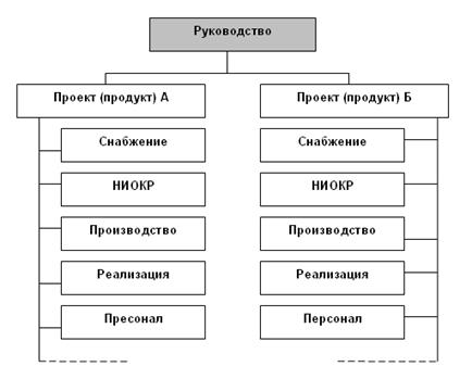 Организация работ по проектированию продуктов как одна из функций производственного менеджмента представляет собой совокупность правил и управленческих решений, направленных на формирование и обеспечение эффективности инновационных процессов на предприятии. Специалисты различают пространственную и временную организацию процессов создания и освоения новых изделий на предприятии. Временная организация устанавливает календарную последовательность и сроки выполнения отдельных заданий, стадий и этапов проектирования, загрузку исполнителей. Пространственная организация выражается через разделение заданий на отдельные задачи и операции, объединение их в однородные группы или комплексы и закрепление за определенными специально создаваемыми структурными подразделениями предприятия. Таким образом, пространственная организация инновационных процессов выражается через организационную структуру предприятия.