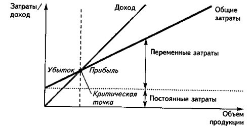 Наиболее распространенным методом экономического обоснования мощности является анализ критической точки. Этот метод успешно применяется для обоснования выбора вариантов инженерных решений и организационно-технических мероприятий как при проектировании, так и планировании производственных процессов. Анализ критической точки предназначен для обоснования мощности путем отбора и идентификации объема выпуска с наименьшими общими затратами. Целью анализа является нахождение точки (в денежных единицах или единицах продукции), в которой затраты равны доходу; эта точка является критической точкой (точкой безубыточности). Анализ критической точки требует оценки постоянных затрат, переменных затрат и дохода. Постоянные затраты— это затраты, которы& существуют, даже если ничего не производится. Переменные затраты — это затраты, которые варьируются с изменением объема производства. Главная компонента в переменных затратах — это затраты труда или материалов. Важным элементом анализа критической точки является функция дохода (рис. 7.1).