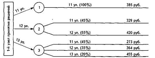 Пример 9.2 Оптовый склад обслуживает кино- и фотолаборатории, в том числе отпускает им проявитель. Статистика уровня продаж: 11 упаковок продаются с вероятностью 45%, 12 упаковок — с вероятностью 35%, 13 упаковок - 20%. Прибыль от реализации одной упаковки — 35 руб. Непроданные упаковки в конце недели уничтожаются, при этом потери составляют 56 руб. с каждой упаковки. Какой недельный запас проявителя является Для склада оптимальным? Отметим, что сумма вероятностей продажи 11, 12 и 13 упаковок равна 100%. Это означает, что никаких других объемов недельных продаж не зарегистрировано и в расчет они не могут быть включены. Рассчитаем платежи: а) проданы 11 упаковок: 35 х 11 = 385 руб., при запасе в И упаковок; б) проданы 11 упаковок при запасе в 12, а одна упаковка уничтожена1 385-56 = 329 руб.; - в) проданы 12 упаковок (весь запас): 35 х 12 = 420 руб., наличие спроса из 13 упаковок здесь ничего не меняет; г) при запасе в 13 упаковок возможны три варианта: продажа 11 упаковок (385 - 56 х 2 = 273 руб., две упаковки уничтожены), продажа 12 упаковок (420 — 56 = 364 руб., одна упаковка уничтожена), продажа 13 упаковок (35x13 = 455 руб.). Результаты расчета сведены в табл. 9.2. Расчет ЕМУ показывает, что лучший вариант решения - запасать 11 упаковок. Рассчитаем предельную цену полной информации о продажах (алгоритм ее расчета будет показан в следующем разделе): EVPI = 385 х 0, 45 + 420 х 0, 35 + 455 х 0, 20 - 385 = 26, 25 руб. Дерево решений этой задачи имеет следующий вид: