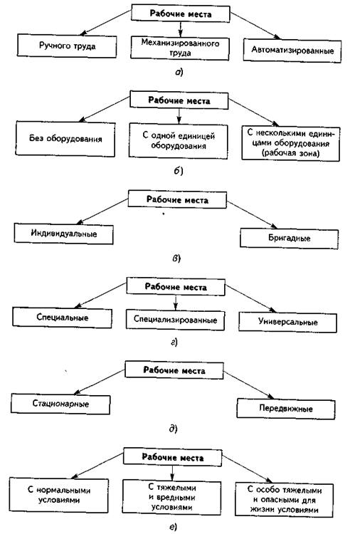 Рис. 11.1. Классификация рабочих мест: а - по уровню автоматизации; б - по количеству единиц оборудования; в - по числу основных рабочих; г - по уровню специализации; д - по степени подвижности; е - по условиям труда К изделиям со сходными технологическими маршрутами относятся такие, которые имеют различное число операций, выполняемых на одних и тех же рабочих местах, в одной и той же последовательности. Такие предметно-замкнутые участки представляют собой первичную форму организации поточных линий и имеют поэтому ряд преимуществ по сравнению с другими участками. С другой стороны, чем больше стецень кооперации данного предметно-замкнутого участка с другими производственными участками и меньше степень его замкнутости, тем больше предметный участок приближается к технологическому. Число всех возможных вариантов сходных технологических маршрутов Iсм для одной определенной последовательности выполнения операций составляет: