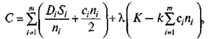 где сi — коэффициент, показывающий соотношение затрат на хранение единицы ресурса и его цены; l — неопределенный множитель Лагранжа; Di — общая потребность в i-ресурсе; Si — затраты, связанные с приобретением i-го ресурса. Чтобы минимизировать общие издержки, продифференцируем это выражение и приравняем производную нулю. Получим решение в виде: