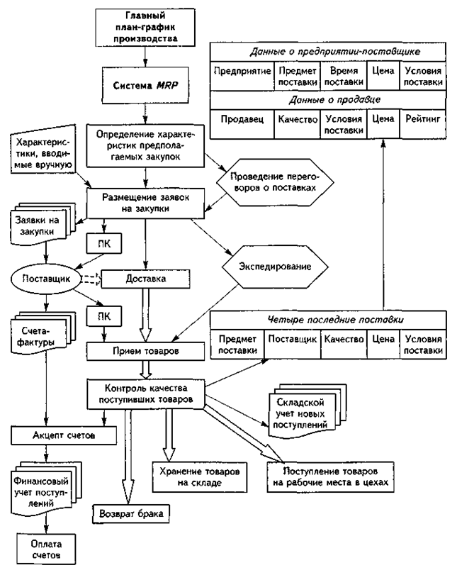 Рис. 21.5. Схема управления производственным процессом на внутрицеховом уровне Контроль использования мощностей является еще одним механизмом мониторинга материальных потоков в производственной системе и оценки выполнения планов использования производственных мощностей. О движении производственных потоков можно судить, контролируя вход и выход системы, что является одной из функций системы MRP II. Именно цеховой уровень управления связан с возникновением и обработкой большей части управленческой информации: о состоянии выполнения работ и возникающих отклонениях, о нарастании затрат, поломках оборудования и резервах рабочей силы, возникновении брака, путях транспортировки предметов труда и др. Огромную роль здесь играет обеспечение оперативности, достоверности и точности собираемой информации обратной связи, так как именно на ней основано принятие последующих управленческих решений и именно от нее зависит качество управления. В главе 23 будет продолжено рассмотрение вопросов разработки расписаний и управления производственными потоками ввиду их высокой сложности и особой значимости для эффективного функционирования производства. Управление закупками. Закупочный менеджмент — это управление закупаемыми партиями материалов и компонентов изделий, полностью согласующееся с планами производства продукции. В настоящее время затраты на обеспечение закупок на большинстве предприятий достаточно велики. Их уменьшение даже на несколько процентов может внести существенный вклад в сокращение сроков окупаемости вложений в такую капиталоемкую систему, как MRPII. Без использования современных систем автоматизированного управления закупками основное время «снабженцев» (в традиционно российском понимании этого слова) тратилось на чисто технические работы, а именно: на оформление документов, отслеживание прохождения оплаты заказов, контроль и экспедирование грузов и т. д. Использование компьютеризированной процедуры управления закупками в системе MRPII позволяет перенести центр тяжести работ на поиск лучших поставщиков, проведение переговоров с ними с целью улучшения соотношения «цена - качество» закупаемых материалов и компонентов производимых изделий, выбор оптимальных маршрутов и средств доставки грузов и т. д. Содержание функции закупок заключается в превращении заявок, сформированных, например, в системе MRP, в запасы требуемого состава, количества и качества, в заданные сроки и с минимальными затратами. Главный план-график производства определяет работу системы MRP, которая, в свою очередь, формирует заявки на все необходимое для производства. В заявку вручную могут быть добавлены позиции, не являющиеся расшифровкой Одновременно подбираются комплекты компонентов изделий для их дальнейшей обработки (сборки). Таким образом, статус заказов находится под постоянным контролем по мере продвижения компонентов по операциям производственного процесса. Информация, сопровождающая заказы, может располагаться как на бумажных носителях, так и быть записанной в память ПЭВМ единой системы управления производством. При обозначении компонентов последнее время все чаще используется штрих-кодирование. Наличие штрих-кодов позволяет быстро переходить от одной формы записи информации к другой. Контроль использования мощ