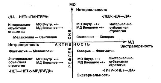 Используя эту схему, рассмотрим описание четырех основных типов мотивации (мотивационных стратегий). «ЛЕВ»: Основной способ (мотив) взаимодействия — «да-да», то есть мотив взаимного принятия внутреннего и внешнего, их взаимного положительного отрицания, обусловливающего возможность саморазвития личности. Конструктивное единство мотивации достижения и мотивации отношения, результатом которого является стремление к сотрудничеству. Уравновешенность внутреннего и внешнего во взаимодействии является основой баланса целей и отношений как во внешнем» так и во внутреннем планах личности. В идеале «Лев» на основе интернальности и экстравертности устремлен к совместному творчеству во всех основных видах деятельности и в преодолении разногласии (по К. Томасу — стремление к сотрудничеству). Подчеркнем, что не отношение МД к МО, а способы взаимодействия являются причинным основанием типологии мотивации, в том числе основанием выделения самого этого подразделения мотивации на МО и МД. Может быть Учителем (с большой буквы), директором, основателем (научной) школы, собирателем, пастырем, духовным наставником, мастером на все руки. Пассионарность его имеет чрезвычайное общественное значение. Но при нетребовательном к себе отношении и общественной невостребованности «вырождается» в безобидного весельчака, мечтателя, болельщика в общественных явлениях, завсегдатая компаний, «своего парня». В случаях крайнего напряжения душевных и физических сил обнаруживается по параметру личностной реактивности в темпераменте холерика, в то время как обычное личностное состояние по параметру его конструктивной активности — сангвиния. Это следует понимать так, что «львом» не рождаются, им становятся. Причем скорее всего это происходит либо в сфере общения, либо в познавательной деятельности, где для этого имеются специфические, собственно человеческие, родовые для человека разумного «тепличные» условия. Особенно часто тип «льва» диагностируется в научной среде, в выборках школьников и студентов, в благополучных семьях и производственных объединениях. В то же время вне оптимальных условий деятельности или вне специального воспитания «лев» при той же самой мотивационной стратегии проявляет себя, согласно нашей модели типологического единства личности, именно своим естественно-реактивным образом, как холерик, со всеми вытекающими из этого следствиями. В различной мере эффект самовоспитания демонстрируют такие, например, «львы», как Сергий Радонежский, Д. И. Менделеев, В. И. Вернадский, И. П. Павлов. «ПАНТЕРА»: Основной способ (мотив) взаимодействия — «да — нет», то есть мотив реконструктивного единства мотивации достижения и мотивации отношения, когда самоактуализация личности осуществляется в общении скорее от ума, нежели от сердца. Результатом этой реконструктивной мотивации чаще всего является «избегание» (по К. Томасу) сложных ситуаций, где вновь возникают острые вопросы взаимодействия внутреннего и внешнего. Духовная работа над собою, обостренная рефлексия в самосовершенствовании в целом представляют «пантеру» как интернала, но обращенного более вовнутрь, — то есть интроверта. Мотивация отношения к самому себе доминирует над мотивацией достижения; самоотношения доминируют над целями — более важным становится постижение 