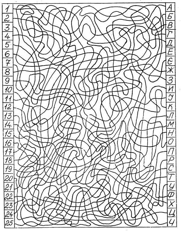 1. Експеримент проводиться у парі студентів: один виступає в ролі експериментатора, другий - в ролі досліджуваного. Потім студенти міняються ролями. 2. Інструкція досліджуваному Перед Вами таблиця для дослідження (і тренування) стійкості уваги. Кожному числу в лівому сповпці відповідає літера у правому стовпці. Вам треба якомога швидше для кожного числа, починаючи з одиниці, визначити відповідну літеру. Для цього Ви повинні простежити поглядом шлях кожної лінії, що з`єднує число і літеру, від початку і до кінця. УВАГА! СТЕЖИТИ ЗА ЛІНІЄЮ МОЖНА ЛИШЕ ПОГЛЯДОМ! ЗАБОРОНЯЄТЬСЯ КОРИСТУВАТИСЯ РУЧКАМИ, ОЛІВЦЯМИ АБО ПРОВОДИТИ ПО ЛІНІЇ ПАЛЬЦЯМИ! Працювати почнете після сигналу експериментатора. Число і відповідну літеру відзначайте на своєму аркуші паперу. На виконання завдання відводиться 7 хвилин. 3. Інструкція експериментатору: 3.1 Відзначайте кількість ліній, переглянутих за кожну хвилину; на виконання завдання відводиться 7 хвилин. 3.2. Стежте за поведінкою досліджуваного, відмічаючи такі факти: - чи правильно досліджуваний зрозумів інструкцію; - чи були великі затримки в роботі, де, на якій хвилині, на якій лінії, чим вони викликані; - чи були повернення до початку лінії; - чи відволікався досліджуваний на сторонні подразники; - наскільки емоційно (або стабільно, спокійно) виконував роботу, чи нервувався під час виконання роботи, чи з’являлися зайві рухи, слова, емоції, метушня, або, навпаки, досліджуваний припиняв діяльність; - чи зорієнтований досліджуваний на швидкість виконання завдання чи, навпаки, на точність роботи.
