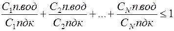 Формула (2) позволяет прогнозировать санитарное состояние воды при всех заданных параметрах, входящих в нее. Прогноз осуществляется путем сравнения Сп.вод с установленной для данного вещества предельно допустимой концентрацией Cпдк. Если значение Сп.вод меньше Спдк, то прогноз благоприятен и разбавления сточных вод достаточно. В противном случае, когда Сп.вод > Cпдк, необходимо принять меры по уменьшению концентрации загрязнения (данного вредного вещества) в реке перед расчетным пунктом водопользования за счет проведения следующих мероприятий: * уменьшения количества сточных вод, сбрасываемых в водоем; * снижения концентрации загрязнения в сточных водах за счет их разбавления чистой водой; * снижения концентрации загрязнения в сточных водах либо за счет дополнительных систем очистки, либо совершенствования технологических процессов. При поступлении со стоком в водный объект нескольких веществ с одинаковым лимитирующим показателем вредности сумма отношений концентрации каждого из веществ в водном объекте (С1n.вод, С2n.вод,... СN n.вод) к соответствующим ПДК не должна превышать единицы: