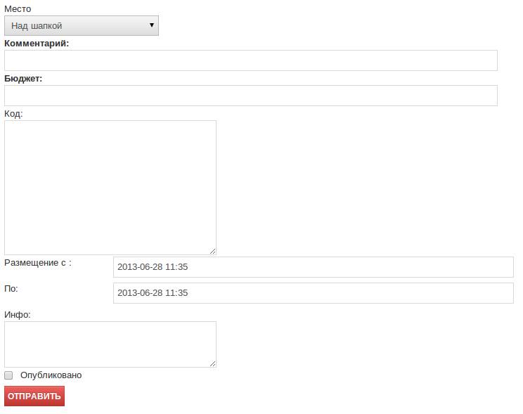 Место: Выбор места размещения Комментарий: комментарий для колег Бюджет: бюджет размещения Код: полный код баннера Размещение с, размещение по: Даты размещения, после котортых слот снимается Инфо: служебная информация Чекбокс “Опубликовано”: при простановке этого чекбокса код появится в выбранном месте.