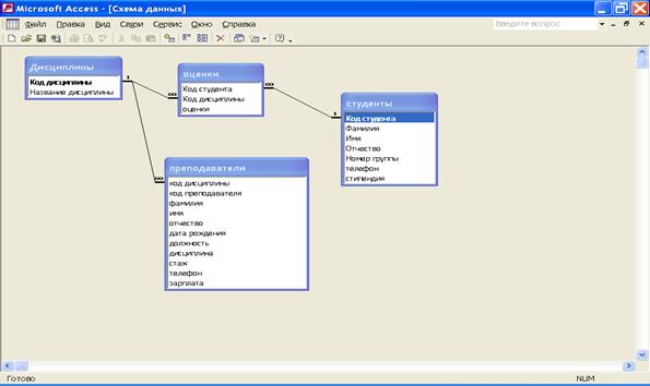6. Разработайте схему данных, т.е. создайте связи между таблицами. Для этого: § выполните команду Сервис, Схема данных. На экране появится окно " Схема данных"; § выполните команду Связи, Добавить таблицу; § в появившемся окне будет выделено название одной таблицы. Щелкните по кнопке < Добавить>; § переведите выделение на имя следующей таблицы и щелкните по кнопке < Добавить>. Аналогично добавьте оставшиеся две таблицы; § закройте окно, щелкнув по кнопке < 3акрыть>; § создайте связь между таблицами Дисциплины и Оценки. Для этого подведите курсор мыши к полю " Код дисциплины" в таблице Дисциплины щелкните левой кнопкой мыши и, не отпуская ее, перетащите курсор на поле " Код дисциплины" в таблицу Оценки, а затем отпустите кнопку мыши. На экране откроется окно " Связи"; § установите флажок (" галочку") в свойстве Обеспечение целостности данных, щелкнув по нему; § установите флажок в свойстве Каскадное обновление связанных полей и Каскадное удаление связанных записей; Примечание. Задание каскадного обновления связанных полей и каскадного удаления связанных записей позволит вам отредактировать записи только в таблице Дисциплины, а в таблице Оценки эти действия будут со связанными записями выполняться автоматически. Например, если вы удалите из таблицы Дисциплины один предмет, то в таблице Оценки удалятся все строки, связанные с этим предметом. § щелкните по кнопке < Создать>. Связь будет создана; § аналогично создайте связи между полем " Код дисциплины" в таблице Дисциплины и полем " Код дисциплины" в таблице Преподаватели, а также между полем " Код студента" в таблице Студенты и полем " Код студента" в таблице Оценки. Результат представлен на рис. 6; § закройте окно схемы данных, ответив ДА на вопрос о сохранении макета.