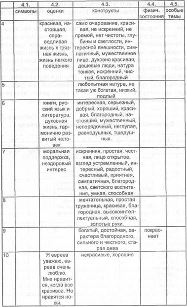 Из числа тем или сфер однозначно лидирует интимная (14 рассказов), за ней идут социальная (8), семейная (5), абстрактно-философская (4). Удивляет практически полное отсутствие личной темы, связанной с перспективами будущего. Более понятно отсутствие сексуальной темы по причинам, обсуждавшимся выше, и профессиональной темы, которая совершенно не актуальна в данный момент для И. в связи с доминированием проблем интимного характера. Кстати, социальная и семейная темы практически везде появляются в дополнение к интимной как отдельные линии сюжетов с интимной доминантой. Из особенностей идентификации вряд ли что-то заслуживает специального внимания. И. склонна достаточно легко, хоть и поверхностно, идентифицироваться с разными персонажами, смещать идентификацию по ходу рассказа с одного персонажа на другого. Легкость идентификации обусловлена как раз ее поверхностностью, а последняя — эго-центричностью И. На первом месте среди потребностей закономерно выступает аффилиация — потребность в дружеских и интимных связях (14 рассказов). Все остальные потребности встречаются намного реже: на втором месте потребность порядка (5 раз, причем исключительно в рамках абстрактно-философских и религиозных тем), затем агрессия (4), оказание помощи и понимание (по 3). Стоит обратить внимание на особенности проявления потребности в агрессии: два раза из четырех она возникает в виде аутоагрессии, а именно самоубийства, причем в расплату за более или менее тяжкие прегрешения (13 и 14), и два раза — как осуществление справедливого возмездия агрессору или Злу вообще (16-1, 16-3). Иначе говоря, агрессия всегда оправдана и мотивирована. Характерно, что рассказ по картине 18, провоцирующей агрессивные импульсы, оказался начисто лишен каких-либо агрессивных мотивов. Все это говорит про довольно сильное вытеснение, отрицание и рационализацию И. своих агрессивных импульсов. Цели более чем в половине рассказов вообще отсутствуют, что говорит о том, что И. больше склонна к реак- тивному поведению, чем к целенаправленному. Там, где они есть, они часто носят абстрактно-морализаторский характер (8, 11, 15, 16-1) либо направлены на преодоление возникших извне проблем (2, 9, 11, 16-3, 18). Реалистичность и разработанность целей находится на разном уровне и не позволяет обнаружить какие-либо закономерности, как и спектр средств достижения целей. Напротив, временная локализация целей исключительно однородна: в настоящем. Таблица 6 Содержательные обязательные показатели (окончание)