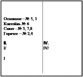 3. По курсам. Лист расчерчивается на 3-4 части, каждая ячейка - Курс. В каждой ячейке записывается блюдо соответствующее этому курсу, и сразу помечается номером Гостя. При этом кол-во блюд пишется слева, а номер гостя справа от наименования блюда. Например: