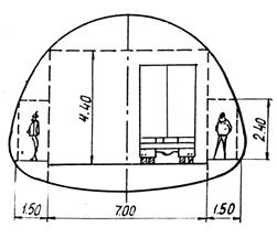 Рис. 24. Схема МГТ для путепровода тоннельного типа Основным типом МГТ являются круглые трубы, имеющие наиболее устойчивую форму сечения. Соединение листов труб выполняют болтами, болтами с крючкообразной головкой, болтами с проушиной. Трубы арочного сечения используют только на прочных грунтах. С 1975 г. в США начали возводить оребренные трубы коробового очертания из алюминиевых строительных листов [49]. Расчет труб выполняли на основе эмпирических формул. С 1978 г. проводятся экспериментальные и теоретические исследования работы таких труб с целью разработки рациональных конструктивных форм. В 1980 г. для расчета труб коробового очертания (рис. 25, а) был использован метод конечных элементов. В 1981 г, 1984 г. проведены дополнительные натурные испытания для детального сравнения с теоретическими данными. К августу 1984 г. в США находилось в эксплуатации около 1 тыс. алюминиевых труб коробового очертания с пролетами от 2, 67 до 7, 75 м, высотой от 0, 76 до 3, 2 м с толщиной листов 4, 5-5 мм. За четыре года эксплуатации только у трех труб при проходе по дороге большегрузных автомобилей были повреждены верхние элементы, так как у этих труб высота засыпки была меньше допустимой. Для уменьшения воздействия временной нагрузки предложены бетонные разгрузочные плиты толщиной 19-24 см, укладываемые непосредственно на трубу или с засыпкой между трубой и плитой (рис. 25, б). Разгрузочная плита наиболее эффективна, если ее длина больше пролета на 0, 3 м с каждой стороны. Плита толщиной 19-23 см должна иметь швы сжатия - растяжения. В работе [40] приведены результаты исследований, величины изгибающих моментов в конструкциях без разгрузочной плиты и с плитой, дан упрощенный расчет разгрузочных плит из бетона на портландцементе.