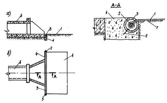 Рис. 30. Конструкция укрепления выходного русла " мягким" материалом: а - продольный разрез; б - вид в плане; 1 - полотнище " мягкого" материала; 2 - стержень крепления полотнища; 3 - металлическая труба с прорезью для полотнища; 4 - бетонный упор; 5 - деревянные пробки; 6 - труба; 7 - грунт; 8 - анкерный штырь За период эксплуатации износа укрепления и размывов не наблюдалось. Новый тип крепления массой 10 кг можно монтировать и демонтировать за 10-15 мин, что принципиально меняет технологию и организацию строительных работ [54]. Примеры расчета деформаций дна и размеров обычных укреплений приведены в методических рекомендациях [57], а гидравлические расчёты труб, водобойных колодцев, быстротоков - в работе [58]. Гидравлические расчеты водопропускных труб из гофрированного металла [1, 59] показывают, что их пропускная способность при безнапорном и полунапорном режимах на 5-7% больше, чем гладких труб. Это объясняется тем, что шероховатость внутренней поверхности трубы не оказывает влияния на гидравлическую работу. Теоретические и экспериментальные исследования водопропускных труб приведены в работах [60-67]. В 1985 г. на IV Республиканской конференции в Саратове была заслушаны доклады по научно-техническим проблемам гидравлики дорожных водопропускных сооружений.