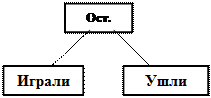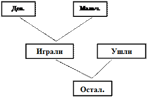 5. Если я буду знать, сколько всего детей играло и сколько ушло, то смогу узнать, сколько осталось играть действием вычитания (ставит в схеме знак «-»). 6. Сразу узнать, сколько детей осталось играть, я не могу, потому что не знаю, сколько всего детей играло (ставит в схеме около «Играли» знак вопроса). 4а. Чтобы узнать, сколько всего детей играло во дворе, надо знать, сколько играло мальчиков и сколько девочек (изображает в схеме). 5а. Если я буду знать, сколько играло девочек и сколько мальчиков, то смогу узнать, сколько всего детей играло действием сложения (ставит в схеме знак «+»). 6а. Я могу сразу узнать, сколько всего детей играло, потому что знаю, что девочек играло 5, мальчиков - 4. 7. Составляю план решения. Сначала действием сложения узнаю, сколько всего детей играло, потом действием вычитания узнаю, сколько детей осталось играть (ставит в схеме соответственно цифры 1 и 2 над знаками действий). Схема приобретает вид: