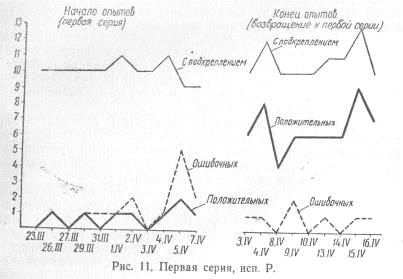 в начале серии реакции испытуемой определяются тепловой чувствительностью, а во второй части серии — чувствительностью к видимым лучам. Этот вывод полностью подтверждается вторым критическим экспериментом, состоявшим в переводе испытуемой со ступени «IX» на ступень «N». Эта последняя ступень (напомним, что она соответствует постоянным условиям первой серии) отличается от предшествующей дальнейшим резким понижением излучаемого тепла (0, 011—0.006Q) и одновременно еще более резким — в несколько раз — повышением освещенности. Если реакции испытуемой по-прежнему определяются тепловым эффектом, то ее перевод на эту новую для нее ступень будет связан с понижением числа правильных реакций. Если же наш вывод верен, т. е. испытуемая Действительно ориентируется теперь на воздействие света, то переход к раздражителю «N» не будет для нее затруднительным. Первый же опыт после опытов с раздражителем «IX», проведенный с нормальным раздражителем, дал следующие результаты: правильных снятий руки — 6, пропущенных раздражителей — 4, ошибка —1. Второй опыт: правильных реакций — 8, пропущенных — 4, ошибка — 1 (последующие опыты приведены на рис. 11). Приведем показания испытуемой после первого опыта с нормальным раздражителем. Экспериментатор: — При каких условиях Вы снимаете руку? — Испытуемая: «Если рука влажная, то как бы сушит, если же рука не влажная, то я слышу как бы легкое прикосновение, а потом как бы ветерок такой легкий. Раньше, с месяц тому назад, было ощущение другое, более резкое. Иногда сразу могла чувствовать». Второй испытуемый — Мих. был также предварительно проведен через опыты с раздражителем «N» (первой серии). Суммарные результаты по 12 опытам: 6 правильных снятий, 22 ошибочных реакции и 112 пропущенных раздражителей. Начиная с 13-го опыта с ним были поставлены эксперименты с раздражителями второй серии. Ступень раздражителя «II» испытуемый проходит в первый же опыт («с места»). Раздражитель «III» требует уже восьмидневной тренировки, хотя порог тепловой чувствительности испытуемого почти в два раза ниже величины получаемого тепла (то же явление, что и у испыт. Р.) Ступень «IV» (0, 064Q) испытуемый проходит в течение всех трех опытов; ступень «V» (0.049Q—величина, близкая к порогу) снова, как и у испыт. Р., оказывается для него наиболее трудной. Первые удовлетворительные результаты с этим раздражителем мы получили у испытуемого только на 11-м опыте, после чего сразу же перешли к критическим экспериментам. Задача критических экспериментов с этим испытуемым состояла прежде всего в том, чтобы получить на участке наибольшего разведения кривых нашей шкалы возможно резче выраженную зависимость реакций испытуемого от соотношения интересующих нас моментов. Поэтому мы впервые применили в опытах с этим испытуемым методику возвращения к предшествующим раздражителям («попеременность» раздражителей). В следующем после опытов с раздражителем «V» эксперименте мы в первой его части дали раздражитель «VI», а во второй его части — раздражитель «VIА». Результаты были получены такие. В первой части опыта (0, 037Q, освещ. в усл. эл. ед.— 24): правильных снятий — 1, пропущенных раздражителей — 7, ошибок — 4. Во второй части опыта (0.034Q, освещ. в усл. эл. ед. — 36): правильных снятий — 5, пропущенных раздражителей — 5, ошибок — 2. Таким образом, как и у испыт. Р., мы получили при пониж