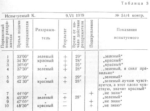 Как показали полученные данные, испытуемые в этих новых условиях дают сразу же ясные положительные результаты. У испытуемого К. мы имеем следующие данные (табл. 2). В данных этих опытов особенно выразителен тот факт, что общее количество ошибочных реакций оказалось ничтожно малым — всего 8 случаев, что составляет в среднем менее 4%. Приведем суммарные результаты опытов еще с одним испытуемым: число правильных реакций — 72%, ошибочных реакций — 12%. Третий испытуемый, не прошедший через опыты первой серии, дал по этой методике обычную картину «тренировки», т. е. впервые 15 экспериментов — величины, близкие к расчетной вероятности, а затем медленно поднимающуюся кривую возрастающих правильных реакций. Так как опыты с этим испытуемым по условиям времени довести до конца не удалось, то главные эксперименты этой серии с ним не могли быть поставлены. Перейдем к описанию главных (критических) опытов этой серии. Они производились по методике, которая применялась и в тренировочных опытах. Различие заключалось лишь в следующем: испытуемый перед опытом предупреждался о том, что его рука будет освещаться либо красным, либо зеленым светом и он должен будет научиться различать их действие. В обоих случаях раздражители сочетались, как обычно, с током. Часть опытов шла параллельно тренировочным опытам, частьпосле них. Для того чтобы исключить различие в тепловом эффекте, новый раздражитель подравнивался к нормальному путем подливания раствора в дополнительный фильтр. При этом мы добивались того, чтобы стрелка чувствительного гальванометра, соединенного с микротермостолбиком (ЭДС на 0, 001=75µv), установленным против выреза в верхней крышке установки, при быстром переключении осветителей установки не давала сколько-нибудь заметных колебаний. Рассмотрим раньше данные, полученные в экспериментах с первым испытуемым. В начале опытов испытуемому было дано несколько разных раздражителей, причем после действия каждого из них ему сообщалось, какой именно раздражитель только что действовал. Приведем протокол первого контрольного опыта (табл.3). Результаты, как видно из этого протокола, — положительные: правильных различений — 7, отказов — 3, ошибок — нет. Второй совершенно аналогичный контрольный опыт дал менее удовлетворительные результаты: правильных различений всего 5, отказов — 2, ошибок — 3 (13. IV 1939 № 56/6). После этого опыта с испытуемым были поставлены тренировочные эксперименты (7 опытов) с обоими раздражителями отдельно и поставлен третий — контрольный опыт.