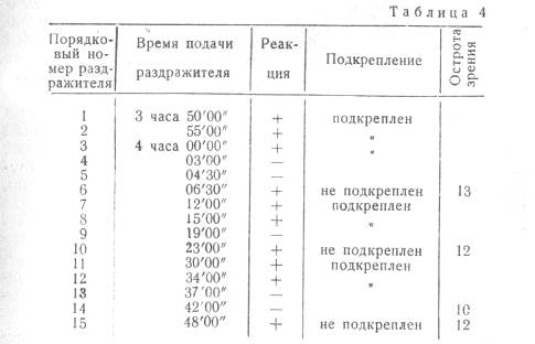 То, что двое из испытуемых (Вор. и Губ.) оказались одновременно в двух группах, объясняется тем, что данные, полученные у этих испытуемых, составляют как бы две фазы: фазу первого появления правильных реакций и фазу ясно выраженной чувствительности, что совпадает с различным количеством проведенных с ними опытов. Как правило, мы впервые ставили контрольные (без подкрепления) опыты с испытуемыми лишь после того, как они впервые давали заметное превышение числа правильных реакций по отношению к ошибкам. Только у двух испытуемых — Кам. и Григ., у которых чувствительность кожи к действию видимых лучей вовсе не могла быть констатирована, опыты с условным сенсорным рефлексом все же в конце серии были проведены. Однако результаты, как и следовало ожидать, получились у них отрицательные: несмотря на весьма большое число сочетаний, сенсорный рефлекс у них не образовался. С испыт. Вор. контрольные опыты с условным рефлексом были впервые поставлены после 150 сочетаний, когда испытуемая дала три правильных реакции, не сделав ни одной ошибки; с испыт. Губ.— после 210 сочетаний, при тех же точно условиях. В обоих случаях результаты отрицательные. Тогда мы продолжили серию опытов с обеими этими испытуемыми и вновь перешли к контрольным опытам после приблизительного сочетаний, когда чувствительность испытуемых к воздействию на кожу видимых лучей не оставляла сомнения. Контроль, как и в опытах с другими испытуемыми, проводился и после правильных реакций и после «пропущенных» раздражителей. Результаты всех этих опытов оказались также отрицательными. Только у одного испытуемого в самых последних экспериментах отмечается устойчивое, но незначительное повышение остроты зрения под влиянием условного раздражителя. Понятно, что полученные в этом исследовании результаты не могли быть обсуждены до проведения таких экспериментов, которые могли выяснить самую возможность образования в данных условиях сенсорного условного рефлекса. Поэтому мы провели вслед за описанными выше опытами специальную контрольную серию. Эта серия была проведена на четверых испытуемых и отличалась от предшествующей тем, что неадекватный условный раздражитель был заменен раздражителем адекватным, нормально ощущаемым испытуемыми (метроном). Уже на 8—10-й экспериментальный день мы получили отчетливые положительные результаты. Так, например, для испыт. Вор. в восьмом опыте мы имеем: в условиях нормальной освещенности 1, 1 —1, 2 усл. ед., после действия условного раздражителя—1, 65 усл. ед.; у испыт. Пуст. соответствующие данные (на 10-й день) выражаются в следующих величинах: без действия условного раздражителя—1, 0 усл. ед., после действия условного раздражителя — 1, 35 усл. ед. Аналогичные результаты мы получили и у других испытуемых. Итак, на основании сопоставления как вышеприведенных данных, так и материалов, полученных в предшествующих исследованиях, мы можем сделать следующий предварительный вывод: если нейтральный агент не ощущается (не отличается) испытуемым, то и условный рефлекс на него не может быть выработан. В этом случае раньше должен осуществиться процесс превращения этого агента под влиянием специальных условий в агент, по отношению к которому организм является не только раздражимым, но также и чувствительным, т. е. в агент, «отличаемый», по выражению И. П. Павлова, 