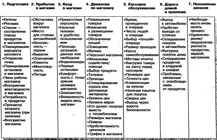 Анализ потребления касается не только того, как люди делают покупки, но и того, как они действуют в магазинах, как сравнивают продукты. Потребительская логистика - это скорость и непринужденность, с которой потребители движутся в магазине и делают покупки; отсчет времени начинается с момента входа в магазин и до момента, когда потребители складывают свои покупки в пакеты. Она включает изучение характеристик магазина (вывески, освещение, обслуживание клиента, работа контрольно-кассовых пунктов) с учетом поведения людей в магазине. Потребительская логистика делит покупателя на семь основных стадий: 1) подготовка к совершению покупки; 2) прибытие к магазину; 3) вход в магазин; 4) передвижение по магазину; 5) проход через контрольно-кассовый пункт; 6) дорога домой и хранение продуктов дома; 7) истощение товарных запасов, стимулирующее повторную покупку. Указанные стадии связаны с местоположением магазинов, планами размещения торговых площадей, шириной проходов, выкладкой товара в месте покупки, работой контрольно-кассовых пунктов, графиком в магазине, обслуживанием клиентов и персоналом, методами оплаты, вывесками и обозначениями, безопасностью магазинов с точки зрения потребителя (см. рис. 5.2). Компании розничной торговли могут пользоваться этим перечнем для сегментирования и организации исследований. Потребительская логистика способствует облегчению процесса покупки (даже при столкновении с негативными факторами). В целом, для улучшения обслуживания и уменьшения времени, которое потребители тратят у кассы, магазины используют технологии, персонал и обучение. Если на продукте нет маркировки или на него снижена цена, потребители могут взять вещь, провести сканером по штрих-коду, узнать цену и принять решение о приобретении товара. Ожидание у кассы - весьма негативный для многих покупателей опыт, особенно если они видят неиспользуемые ресурсы вроде пустых столов в ресторане или неработающие кассы в продовольственном магазине. Ожидания потребителей от изменений покупательской ситуации зависят от типа магазина, который они посещают.