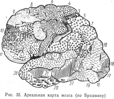 Мозг человека по сравнению с мозгом высших обезьян обладает и гораздо более сложным, гораздо более развитым строением. Уже у неандертальского человека, как показывают слепки, сделанные с внутренней поверхности черепа, ясно выделяются в коре новые, не вполне дифференцированные у человекообразных обезьян, поля, которые затем, у современного человека, достигают своего полного развития. Таковы, например, поля, обозначаемые (по Бродману) цифрами 44, 45, 46 в лобной доле коры, поля 39 и 40 — в теменной ее доле, 41 и 42 — височной доле (рис. 35).