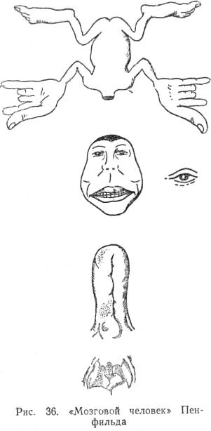 Очень ярко видно, как отражаются в строении коры мозга новые, специфически-человеческие черты при исследовании так называемого проекционного двигательного поля (на рис. 35 оно обозначено цифрой 4). Если осторожно раздражать электрическим током различные точки этого поля, то по-вызываемому раздражением сокращению различных мышечных групп можно точно представить себе, какое место занимает в нем проекция того или иного органа. Пенфильд выразил итог этих опытов в виде схематического и, конечно, условного рисунка, который мы здесь приводим (рис. 36). Из этого рисунка, выполненного в определенном масштабе, видно, какую относительно большую поверхность занимает в человеческом мозге проекция таких органов движения, как руки (кисти), и особенно органов звуковой речи (мышцы рта, языка, органов гортани), функции которых развивались особенно интенсивно в условиях человеческого общества (труд, речевое общение). Совершенствовались под влиянием труда и в связи с развитием мозга также и органы чувств человека. Как и органы внешней деятельности, они приобрели качественно новые особенности. Уточнилось чувство осязания, очеловечившийся глаз стал замечать в вещах больше, чем глаза самой дальнозоркой птицы, развился слух, способный воспринимать тончайшие различия и сходства звуков человеческой членораздельной речи. В свою очередь развитие мозга и органов чувств оказывало обратное влияние на труд и язык, «давало обоим все новый толчок к дальнейшему развитию»[101]. Создаваемые трудом, отдельные анатомо-физиологические изменения необходимо влекли за собой, в силу естественной взаимозависимости развития органов, и изменение организма в целом. Таким образом, возникновение и развитие труда привело к изменению всего физического облика человека, к изменению всей его анатомо-физиологической организации. Конечно, возникновение труда было подготовлено всем предшествующим ходом развития. Постепенный переход к вертикальной походке, зачатки которой отчетливо наблюдаются даже у ныне существующих человекообразных обезьян, и формирование в связи и с этим особо подвижных, приспособленных для схватывания предметов передних конечностей, все более освобождающихся от функции ходьбы, что объясняется тем образом жизни, который вели животные предки человека, — все это создавало физические предпосылки для возможности производить сложные трудовые операции. Подготавливался процесс труда и с другой стороны. Появление труда было возможно только у таких животных, которые жили целыми группами и у которых существовали достаточно развитые формы совместной жизни, хотя эти формы были, разумеется, еще очень далеки даже от самых примитивных форм человеческой, общественной жизни. О том, насколько высоких ступеней развития могут достигать формы совместной жизни у животных, свидетельствуют интереснейшие исследования Н. Ю. Войтониса и Н. А. Тих, проведенные в Сухумском питомнике. Как показывают эти исследования, в стаде обезьян существует уже сложившаяся система взаимоотношений и своеобразной иерархии, с соответственно весьма сложной системой общения. Вместе с тем эти исследования позволяют лишний раз убедиться в том, что, несмотря на всю сложность внутренних отношений в обезьяньем стаде, они все же ограничены непосредственно биологическими отношениями и никог