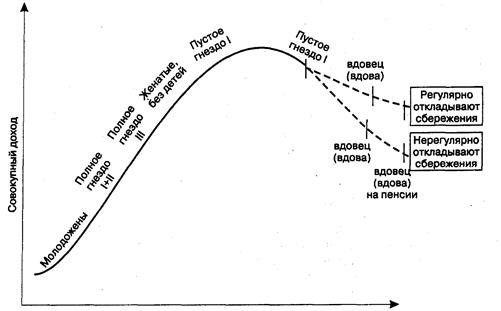 Традиционная концепция ЖЦС отражает происходящие, по мере того как люди женятся, заводят детей, покидают дом, теряют супругов и уходят на пенсию изменения в структуре семьи. Соответственно трансформируется и ее потребительское поведение. Однако потребители не обязательно проходят все эти стадии - они могут «перескакивать» через некоторые этапы в зависимости от избранного образа жизни. На поведение потребителей на разных стадиях ЖЦС влияют такие явления, как развод, уменьшение размера семьи, позднее вступление в брак. Графически ЖЦС можно изобразить в виде кривой, напоминающей кривую жизненного цикла товара (рис. 11.1), где показано изменение доходов семьи в течение ее жизни и влияние поведения в отношении сбережений на уровень доходов на последних стадиях ЖЦС. Когда глава домохозяйства достигает 30 - 40-летнего возраста, уровень дохода часто возрастает (в результате карьерного роста и наличия двух доходов в семье), но одновременно увеличиваются и расходы (особенно если в семье есть дети). На этой стадии свободный доход сокращается, тем самым затрудняя возможность делать сбережения и покупать предметы роскоши. Изменения в ЖЦС в целом и каждой его стадии в отдельности оказывают влияние на спрос на многие потребительские товары - от мебели до путешествий. Компании-производители используют описания жизненного цикла потребителя для анализа маркетинговых и коммуникативных стратегий; в то же время они часто пользуются дополнительной информацией о потребительских рынках для изучения их потребностей, ниш, разработки маркетинговых стратегий для целевых сегментов. Например, добавление социоэкономических данных, особенно уровня дохода, увеличивает точность прогнозов выбора таких товаров, как одежда. При этом поведение потребителей описывается с помощью все того же ЖЦС.