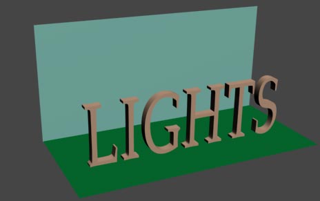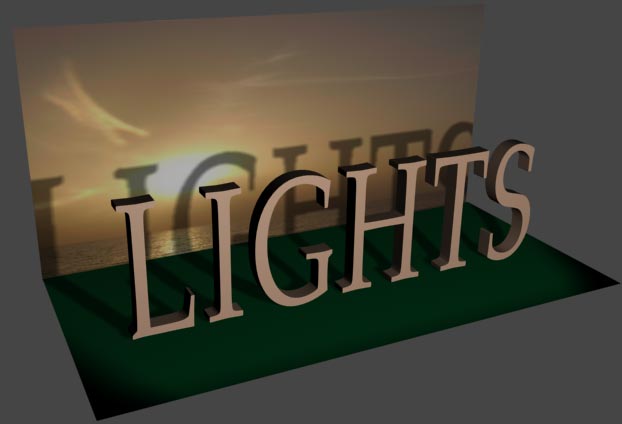 Чтобы расширить зону освещения попробуем изменить параметры источника. Выберите источник Spot01 и на панели Modify в области Spotlight Parameters измените форму светового конуса на прямоугольную, щелкнув на опции Rectangle. Затем установите значения для параметров Hotspot / Beam и Falloff / Field так, чтобы текст оказался полностью внутри границы внутреннего светового конуса, а плоскости — внутри внешнего светового конуса (рис. 53). Корректируя значения соответствующих параметров, обращайте внимание на регулировку соотношения сторон светового прямоугольника параметром Aspect — в противном случае одна из сторон прямоугольников может оказаться чрезмерно вытянутой. В данном случае оптимальным оказалось значение Aspect равное 1, 5. Проведите рендеринг — полученный результат будет значительно лучше, так как теперь освещенными окажутся все три объекта сцены (рис. 54).