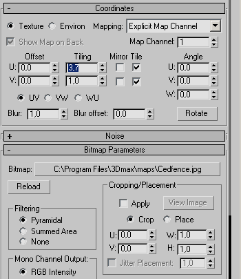 Этот файл входит в стандартную поставку текстур 3ds max 7 и по умолчанию располагается по адресу Диск: \3dsmax7\maps\Wood\CEDFENCE.jpg. В настройках этой карты установите значение параметра Tiling U (Повторяемость по координате U) равным 3, 7 (рис. 5.20).