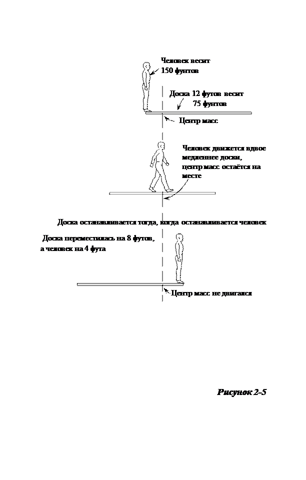 Когда человек начинает идти по доске к её другому концу, он «толкает» доску в обратную сторону. Так как доска вдвое легче человека, то по закону сохранения импульса она должна двигаться вдвое быстрее. Если доска имеет 12 футов длины, то человек продвинется на 4 фута, в то время как доска проскользит в обратную сторону на 8 футов. Когда он остановится на другом конце доски, она остановится тоже. Т.к. человек продвинулся в 2 раза меньше, чем доска, которая вдвое легче его, то центр масс не сдвинется! Более того, он оставался на месте во всё время движения!