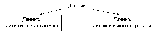 Данные статической структуры – это данные, взаиморасположение и взаимосвязи элементов которых всегда остаются постоянными. Данные динамической структуры – это данные, внутреннее строение которых формируется по какому-либо закону, но количество элементов, их взаиморасположение и взаимосвязи могут динамически изменяться во время выполнения программы, согласно закону формирования.