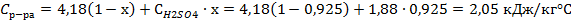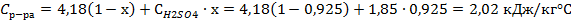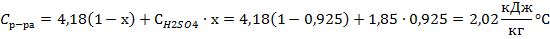 При 25°С увеличиваем теплоемкость на 5%: СФАК = 1, 17·1, 05 = 1, 23 QФАК = 454, 6·1, 23·25 = 13978, 95 КДж · Раствор H2SO4. GH2SO4 = 2117.21 кг (табл. 1.1) В растворе H2SO4 - 92, 5% H2SO4 100%ой и 7, 5% воды