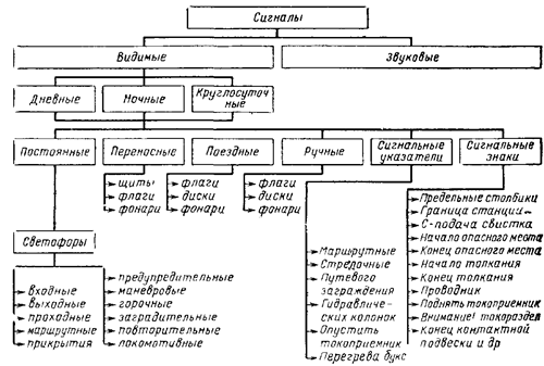 По времени применения видимые сигналы подразделяют на дневные, подаваемые в светлое время суток и сигнализирующие положением или цветом окраски сигнальной установки; ночные, сигнализирующие огнями установленных цветов и подаваемые в темное время суток; круглосуточные, подаваемые одинаково как в светлое, так и в темное время суток и сигнализирующие цветом и числом огней, а также светящимися буквами, цифрами и др. Для подачи видимых сигналов применяют различные сигнальные приборы. Виды и назначение этих приборов, их сигнальные показания, места установки и порядок пользования определены ПТЭ и Инструкцией по сигнализации на железных дорогах Союза ССР. Видимые сигналы в зависимости от сигнальных приборов, которыми их подают, классифицируют на постоянные (светофоры, устанавливаемые в определенных местах железнодорожного пути, и локомотивные светофоры); переносные (щиты, флаги, фонари на шестах, предназначенные для временного ограждения тех или иных участков пути и подвижного состава); ручные (флаги, диски, фонари, посредством которых подают на поезда различные команды и указания). Кроме того, видимые сигналы могут подаваться сигнальными указателями и сигнальными знаками. Сигнальные указатели (маршрутные, стрелочные, путевого заграждения, гидроколонок, перегрева букс и «Опустить токоприемник») извещают о положении определенных устройств — стрелок, гидроколонок и др. Сигнальные знаки подразделяют на постоянные (предельные столбики, «Поднять токоприемник», «Внимание! — токораздел», границы станций и др.) предупредительные («С» — свисток, «Начало толкания», «Конец толкания» и др.) и временные, устанавливаемые в местах неисправности контактной сети, не допускающие прохода электроподвижного состава с поднятым токоприемником, и на участках, где работают снегоочистители. Сигнальные знаки требуют от машиниста локомотива определенного действия (например, «Поднять токоприемник») или сообщают ему определенную информацию («Начало опасного места» и др.). Каждый сигнальный знак в отличие от светофоров и сигнальных указателей, имеющих два и более показаний, имеет всегда только одно сигнальное значение. Сигнальные знаки отличаются и тем, что не имеют собственных источников света, поэтому их размещают так, чтобы при приближении поезда они освещались прожектором. Для лучшей видимости некоторые сигнальные знаки оборудованы отражателями. В качестве постоянных сигналов на железных дорогах применяются светофоры. На некоторых участках до замены светофорами сохраняются семафоры. Постоянные сигналы по назначению делят на основные и предупредительные. Основные сигналы ограждают станции и блок участки на перегонах и подают сигналы, которые разрешают или запрещают движение поездов по этим пунктам или участкам. Предупредительные сигналы извещают о приближении к основным сигналам и о их показании. Основные сигналы в свою очередь в зависимости от назначения подразделяются на в х о д н ы е, ограждающие станции со стороны прилегающих перегонов и служащие для разрешения или запрещения поезду следовать на станцию; выходные, разрешающие или запрещающие поезду отправиться со станции на перегон; проходные, расположенные на перегоне и разрешающие или запрещающие поезду проследовать на ограждаемые ими участки; маршрутные — для разрешения