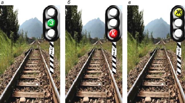 Рис. 5. Заградительные светофоры: а – заградительный светофор подает запрещающий красный сигнал; б – предупредительный светофор (перед заградительными подается желтый сигнал); в – нормально сигнальные огни заградительных светофоров не горят